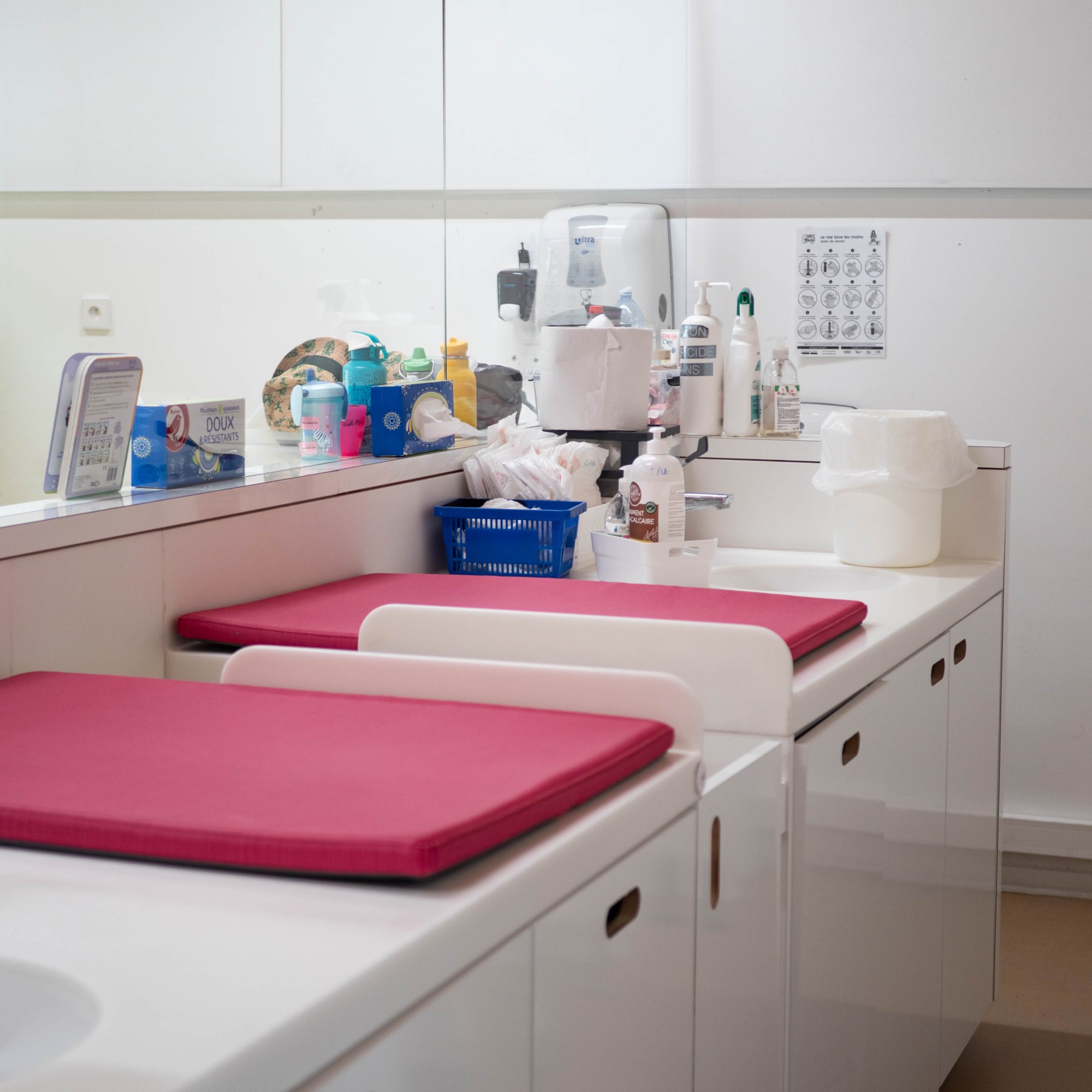 Nous échangeons avec le bébé lors de son change, d’abord nous le prévenons, puis nous accompagnons la gestuelle de regards, de paroles pour que ce moment intime se déroule le plus sereinement possible. Un protocole d’hygiène est suivi, qui implique l’utilisation de liniment ou de savon hypoallergénique, l’application d’une crème adaptée si érythème fessier. Lorsque le nez est encombré, nous profitons également de ce moment pour le laver avec du sérum physiologique. Chez les plus grands, c’est en concertation avec les parents que les débuts de la propreté se feront à la crèche. Pour arriver à contrôler ses sphincters, l’enfant doit d’abord acquérir une motricité aisée; il deviendra propre dès qu’il en aura envie. L’adulte ne met jamais l’enfant en échec. Si celui-ci manifeste qu’il n’est pas prêt, l’équipe n’insiste en aucun cas. L’acquisition de la propreté se fait dans la confiance et le respect de la différence.