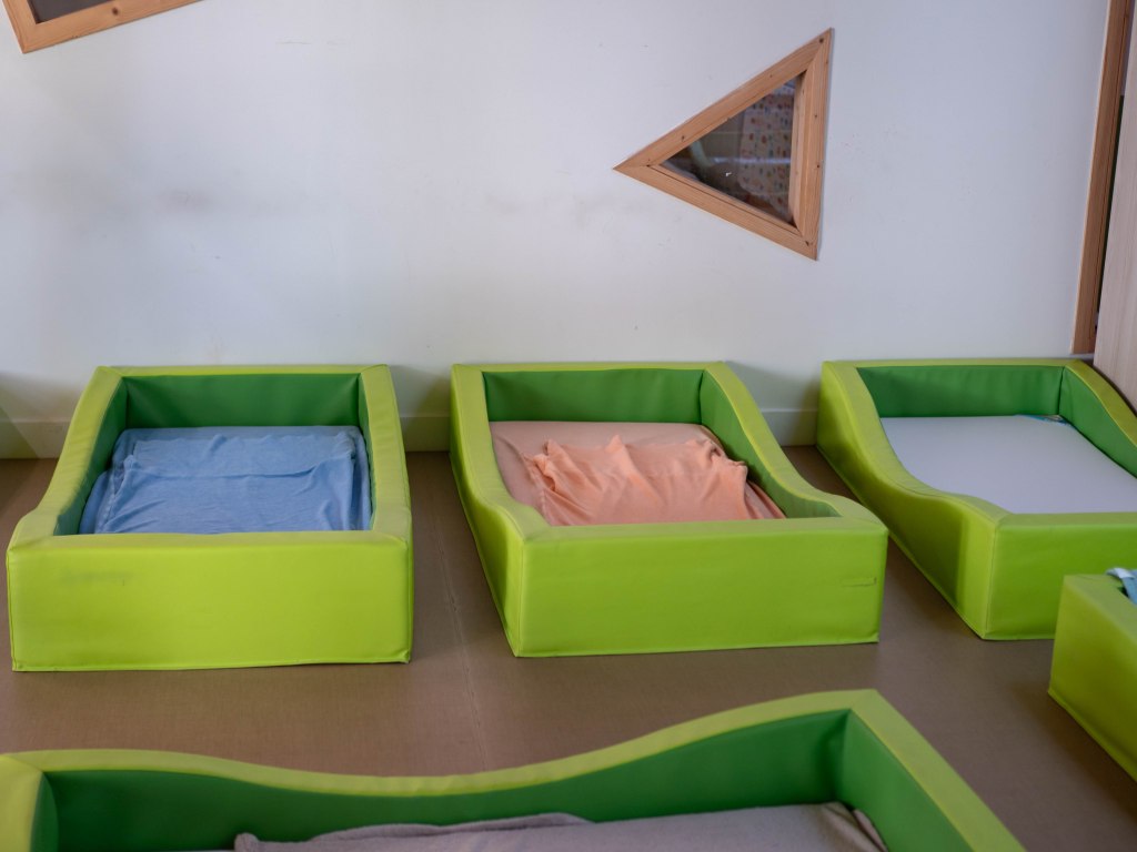 Le sommeil est un temps essentiel au développement de l’enfant. Pour qu’il se sente en confiance et puisse en profiter pleinement, nous essayons de reproduire autant que possible les rituels de la maison : prendre dans les bras, donner le doudou ou la tétine et de respecter le rythme de chaque enfant. Nous avons également des hamacs qui permettent de bercer et de rassurer les bébés qui en ont besoin pour s’endormir. Pour les plus grands, nous pouvons proposer une musique douce ou une histoire.