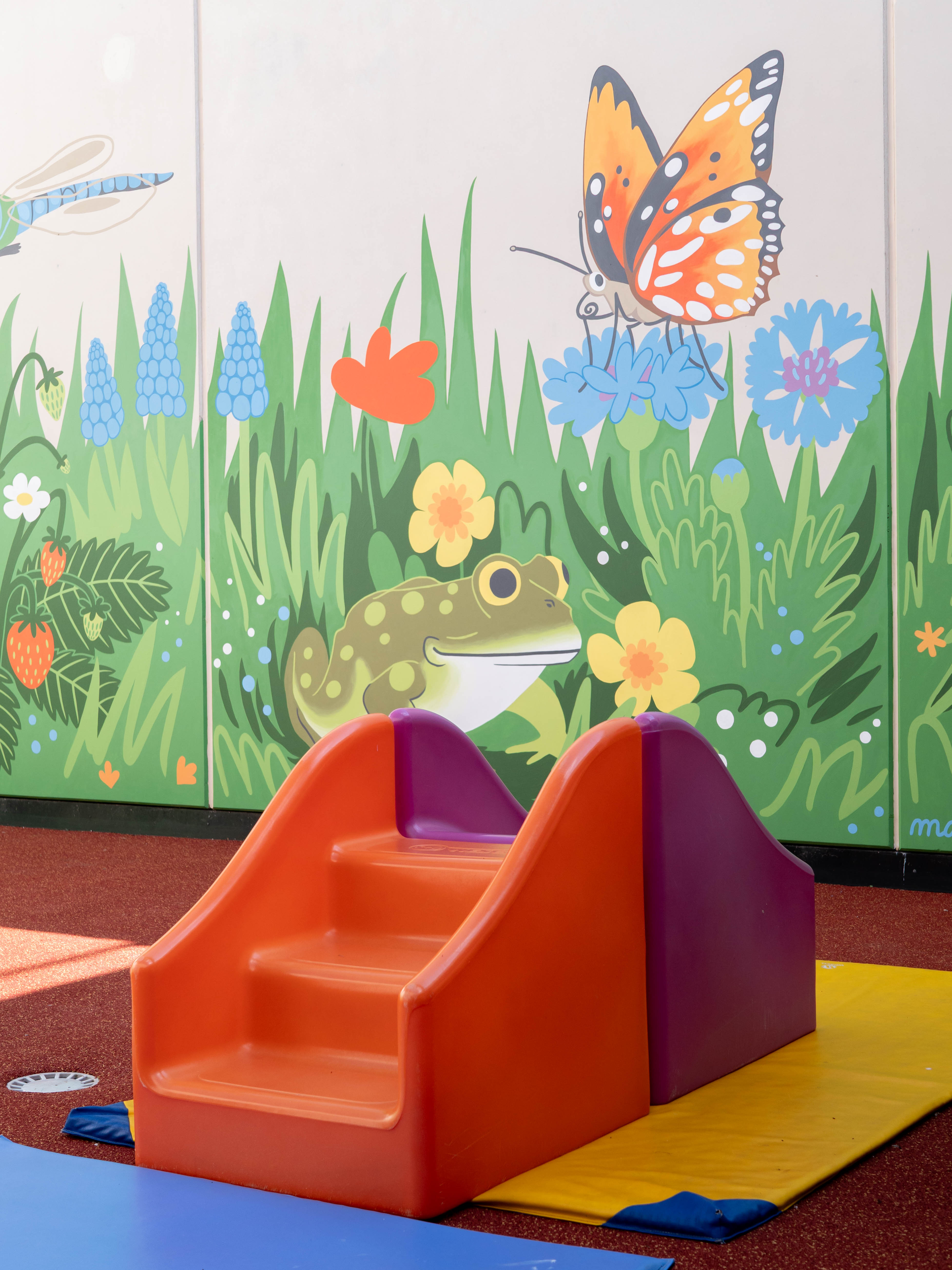 L’ espace des bébés donne sur une cour ornée d’une superbe fresque végétale réalisée par une maman peintre.