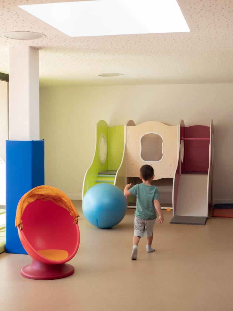 La pièce comprend également une piscine à balles pour des moments sensoriels ludiques, ainsi qu’une salle d’eau permettant des expériences motrices et sensorielles en toute sécurité.